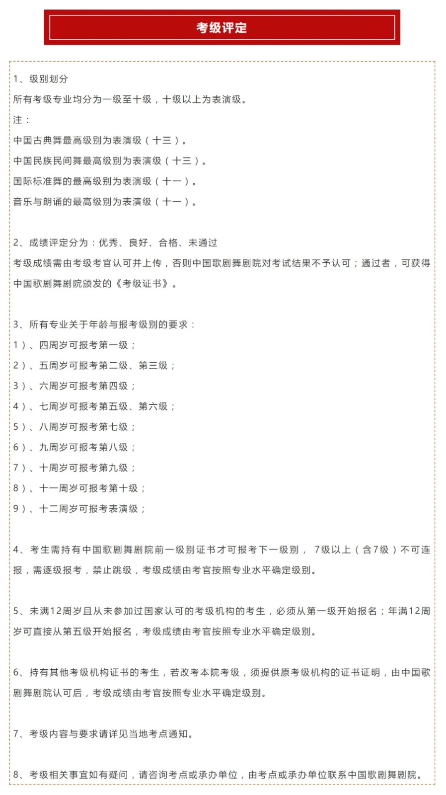 中国歌剧舞剧院考级科目涵盖舞蹈、声乐、器乐、朗诵(表演与口才)。其中中国歌剧舞剧院朗诵考级教材于2009年出版填补了我国朗诵口才教学的空白,文化部社会艺术考级中心也自此增加了朗诵考级科目,从而国内有了系统的教材和规范的教学体系。在朗诵考级教学体系和深度上,为后来涌现的考级教材树立了的标杆和权威性。此外,中国歌剧舞剧院舞剧团也是全国唯一一个国家级的从事民族舞剧创作表演的剧团,是所有舞蹈人才梦寐以求的团体事业单位。交响乐团、民族乐团和管弦乐团也是国家级的职业演奏歌剧舞剧的乐团。